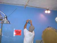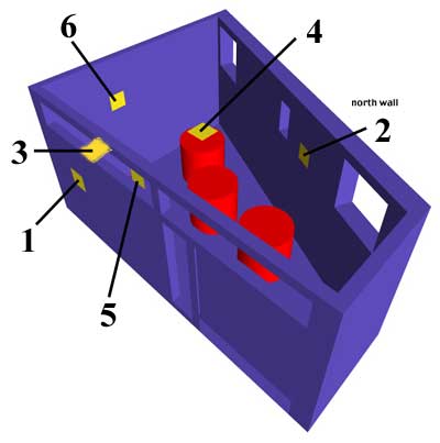 In order to prove (or disprove) our hypothesis, we needed to gather information about the building's heat gains and losses. To do so, we did the following: First, we checked out and launched six HOBO temperature data loggers from the University of Oregon Baker Lab. We went to the test building and attached them to the walls and ceiling as described in Table 1 and Figure 14. We began test timing at 12:15pm Thursday, November 9th and ended the test period at 4:00pm the following Sunday, November 12th. The intent was to determine whether or not the ceiling was, in fact, warmer than the rest of the room. HOBO's were placed on the studio side of the dividing wall to determine if there was a significant difference in temperature on that side of the wall, and if so, how much. We also gathered outdoor temperature information from the Internet and copied the kiln firing logs (see results) to explain any possible deviation from typical incident solar radiation and associated temperature lags. In addition, we further examined the materials used in the building's construction and looked up the R-values for those materials. We also estimated heat gains from the kilns, lights, and inhabitants of the kiln space (see results for R-values and heat gains). After compiling the HOBO and outdoor temperature graph (results), we found that the information was somewhat ambiguous. Therefore, we found it necessary to gather additional information. We used the Raytek pyrameter to take indoor and outdoor surface temperatures of the North wall (figs. 22 & 23) on November 14th at 10:00am. These temperatures were logged on a 32" square grid (width of 4 vertical siding slats) to determine which areas were warmest, implying where the heat was escaping. The HOBO and Raytek graphs are illustrated in the Results section of this study. |